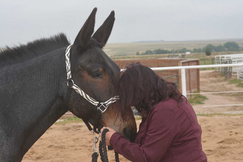 In 2018, Mooshka came into our lives—a stoic blue roan mule saved from the slaughter pipeline. Her eyes told the story of her past, one marked by years of toil and abuse as a working mule. Her body bore the scars of her labor: the telltale stiffness of ringbone and a hip injury that caused her pain. She had little interest in people, her trust worn thin by years of hardship. But there was one exception: my son, Dalton. From the moment they met, Mooshka found comfort in him, as if she knew she had finally found a safe place to land.